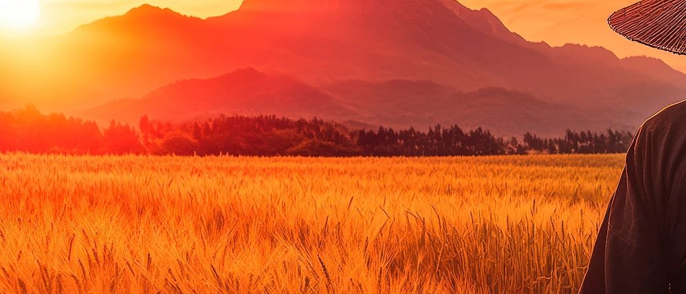 A quiet moment in the golden dusk, where a silent walker in traditional dress enjoys the expanse of a wheat-coloured field. The warm colours of the sunset radiate peace and harmony. This picture lends an inviting atmosphere to any living room and invites you to dream and relax.
