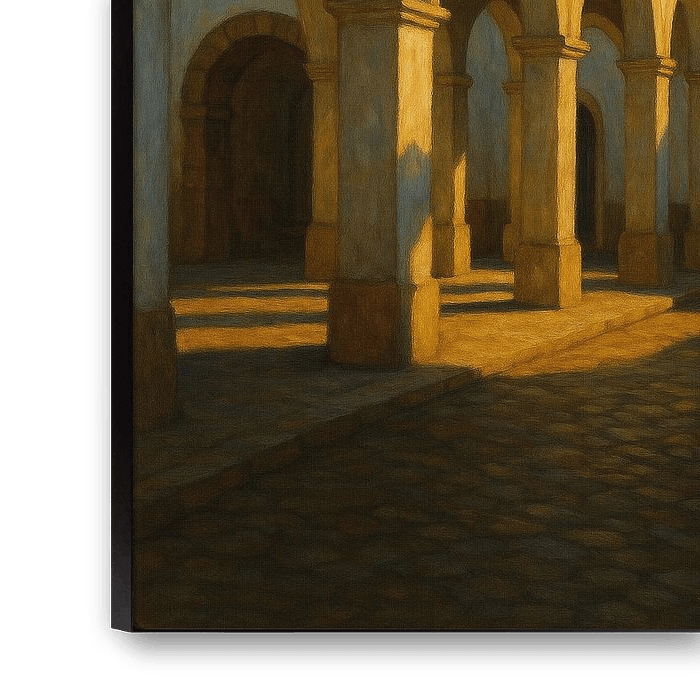 The composition celebrates space and silence. The arches create rhythm and perspective, leading the viewer’s gaze toward the church tower, where light carves out timeless definition. Hopper’s influence lies in the emotional clarity: the stillness of streets that seem alive in their emptiness, the way light defines memory itself.