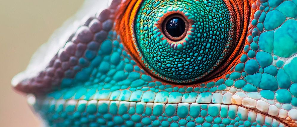 A fascinating interplay of colours and shapes unfolds in this close-up of a chameleon. The vibrant turquoise tones and the impressive, large eye immediately draw the eye. Ideal for a bedroom, it lends the room a calming yet exotic touch that inspires dreams.