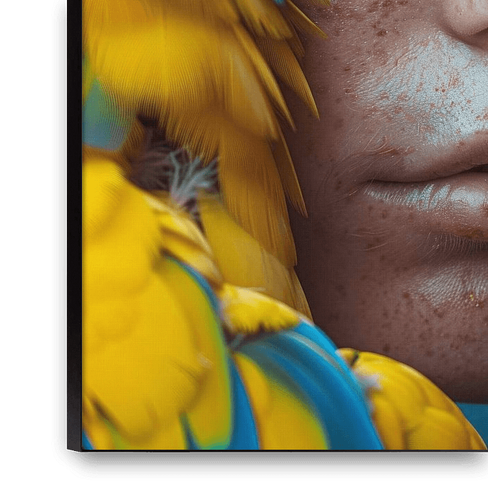 The picture shows a fascinating fusion of man and nature. The face of a person with bright blue eyes is surrounded by colourful veins of feathers in yellow and blue. Golden accents in the eye make-up and the freckles lend the depiction a lively, exotic character, while the emotional portrait provides profound insights.