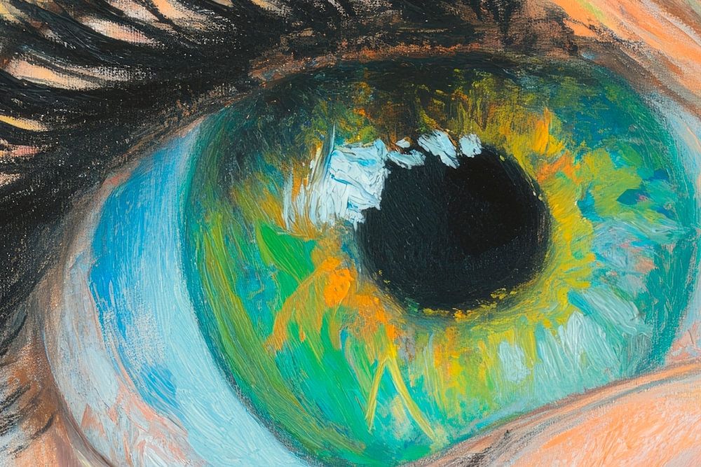 A fascinating eye, vivid in bright shades of green and framed by long, expressive eyelashes, attracts everyone's attention. The gentle colour gradients in the background lend the picture a dreamy atmosphere. Ideal for a living room or creative study, where it encourages inspiration and new perspectives.