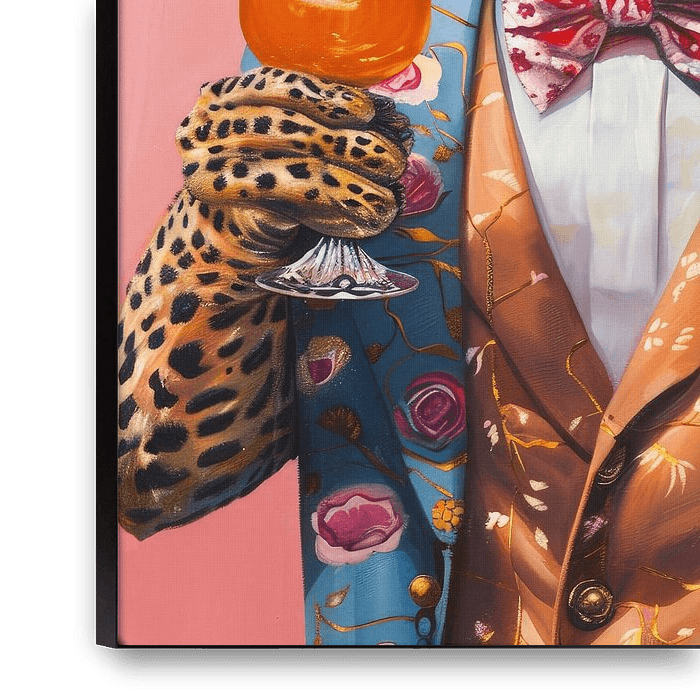 The leopard wears a colourful jacket with a floral pattern in shades of pink and green, combined with a gold-coloured vest and a white shirt. His outfit is completed with a red bow tie with white polka dots,…