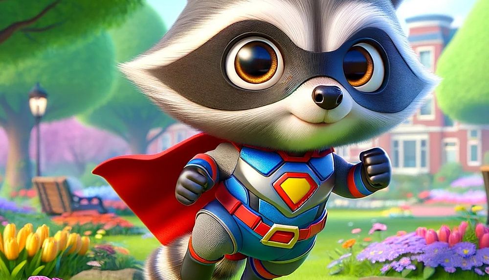 An agile raccoon, dressed in a blue superhero costume with a red cape, sprints through a blooming city park. Trees, flowerbeds and a quiet park bench adorn the surroundings. It's a perfect, sunny day.