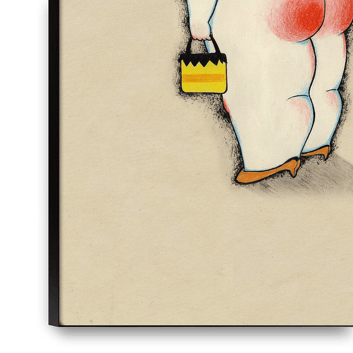 This woman is fat and naked and ashamed of something. That's why her head is hanging. The girl has a handbag, shoes and red naked buttocks.