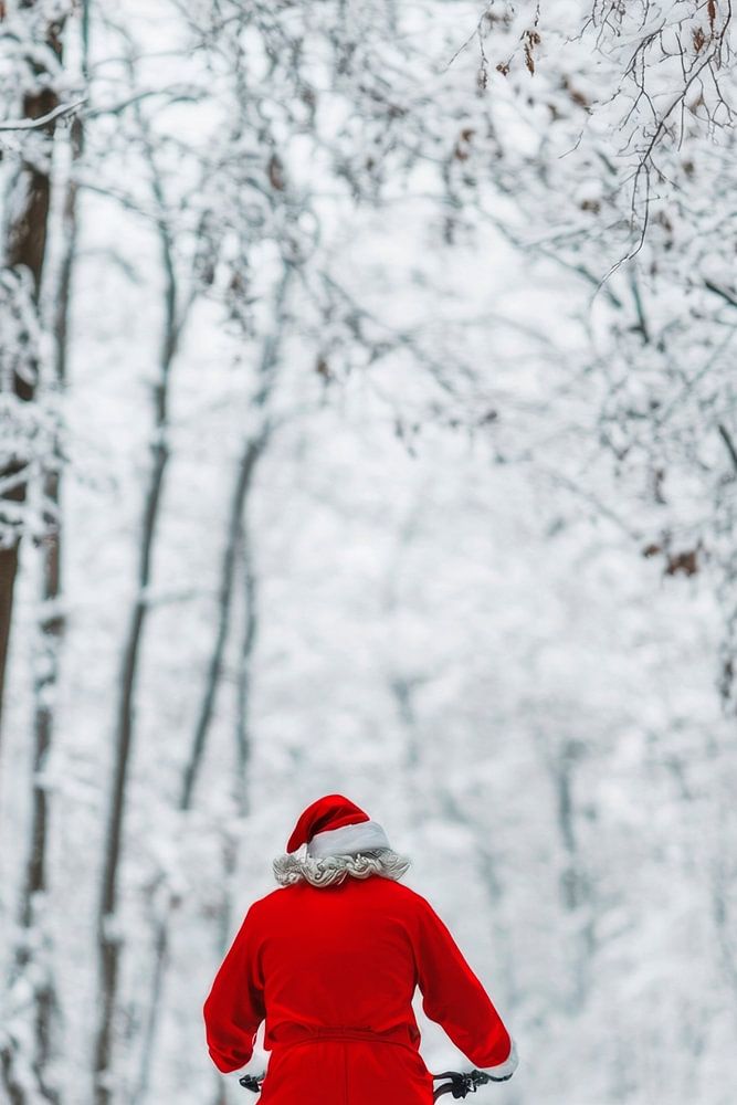 A bright red coat stands out heroically against the brilliant white of the snow-covered landscape. Soft flakes line the trees like a glittering blanket, while a winding cycle track leads through the wintry idyll. The cheerful cyclist, in the Christmas spirit, leaves a trail of joyful anticipation in the cold, still air.