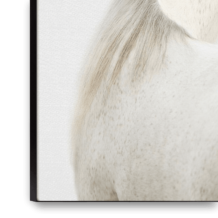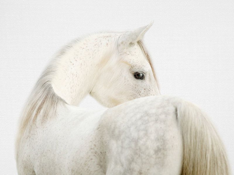 A close-up, profile view of a majestic white horse against a stark white background. The horse's head is turned away, revealing its elegant neck and the side of its face with a dark, expressive eye. Its coat is a soft white with subtle grey speckles, and its mane and tail are a flowing, lighter shade of grey and white. The lighting is…