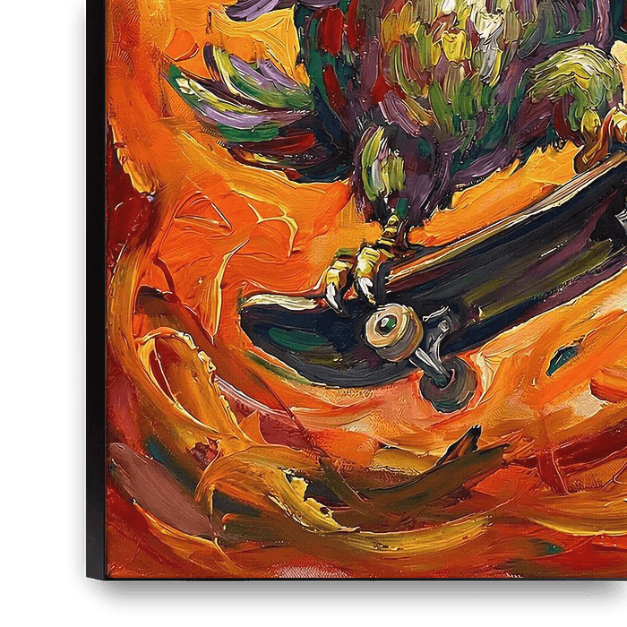 A vibrant and expressive painting of a playful owl riding a skateboard through swirling shades of orange and gold. Bold brushstrokes, dynamic motion, and vivid colors create a sense of energy, courage, and joyful rebellion. This artwork brings a lively and uplifting atmosphere to any space.
