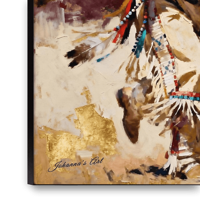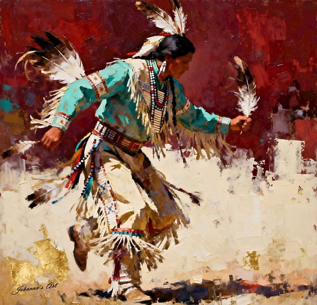 A Native American dancer is captured in fluid motion, wearing vibrant traditional attire that radiates cultural pride and ancestral spirit. The dancer holds feathers with grace and intention, symbolizing connection to nature, ceremony, and storytelling passed down through generations. Every detail of the regalia, from the flowing fabric…