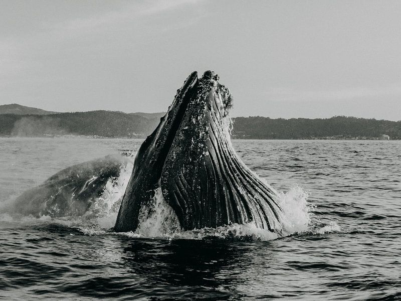 A humpback whale rises vertically out of the water while feeding, an impressive hunting technique in which the animal swallows large amounts of water and prey at once. With its mouth open and throat folds clearly visible, this image shows a rare moment of power and precision. The splashing sea and the whale's tense posture emphasise the…