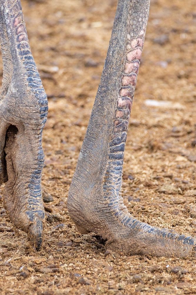 What is immediately noticeable is that ostriches have only two toes per leg-a rarity in the bird world. The larger toe has a powerful, sharp nail that can serve as a kind of weapon, while the smaller toe helps with stability while running. These sturdy, scaly legs are designed to absorb shock and offer incredible strength with every step.