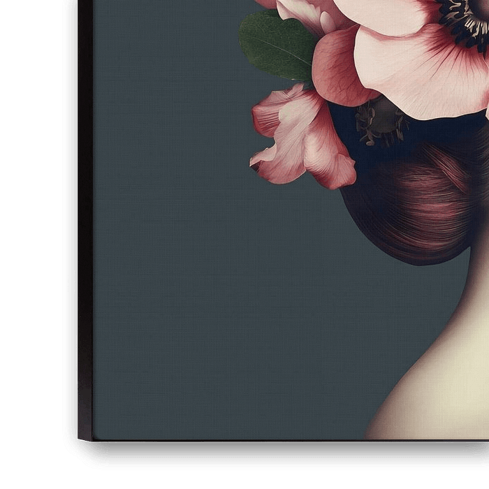 Mystical floral portrait depicting a mesmerising blend of flowers and feminine beauty. This unique piece combines the allure of a captivating portrait with the vibrant energy of lush blooms, creating an atmosphere of timeless elegance.