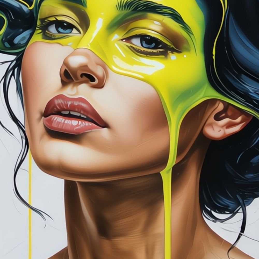 The vibrant colours, with dynamic backgrounds and surreal elements, put the portrait in a new context and stimulate the imagination.