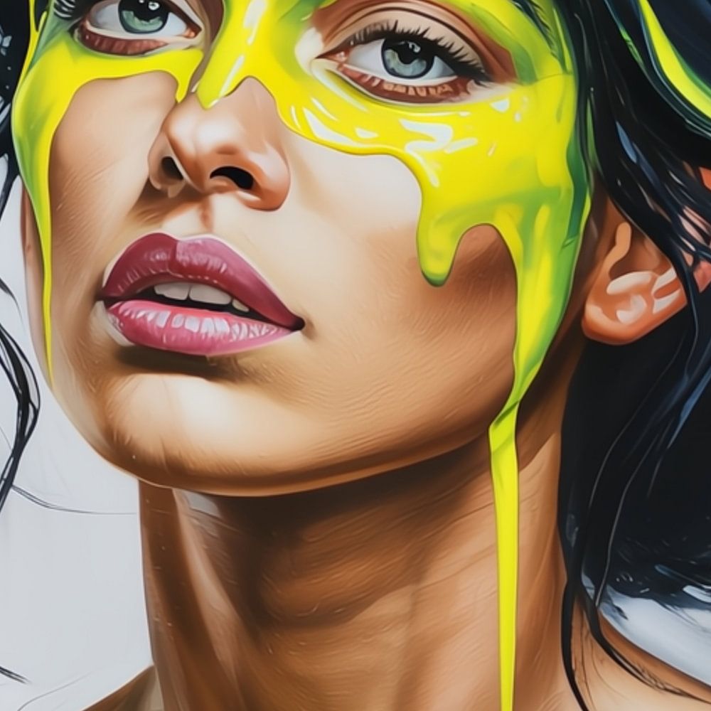 The vibrant colours, with dynamic backgrounds and surreal elements, put the portrait in a new context and stimulate the imagination.