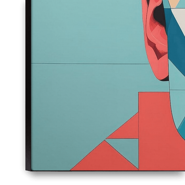 A modern, geometric portrait of a female face, composed of clean planes and sharp lines. Cool blues play against warm coral and salmon tones, creating a vivid colour contrast. Deep shadows and subtle highlights enhance the layering and give the face a powerful, serene look. The rhythmic distribution of triangles and rectangles creates…
