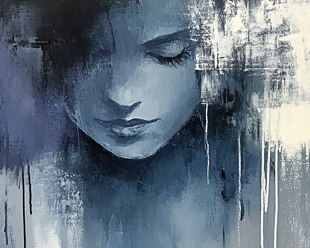Details: woman, portrait, abstract, blue, grey, emotion, introspective, face, art, painting