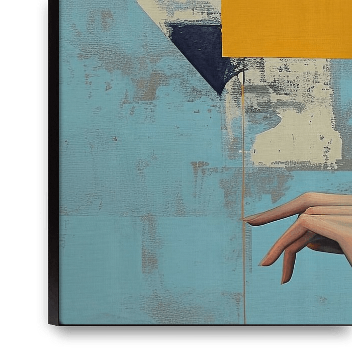 Details: woman, face, abstract, geometric, blue, yellow, orange, serene, profile, art