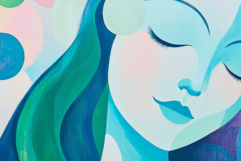 A gentle presence envelops the room, while harmonious colours touch the soul. The calm facial features and flowing hair exude serenity, while playful circles add vibrant energy. This artwork would be a perfect focal point in the bedroom, where it creates a peaceful atmosphere and invites relaxation.