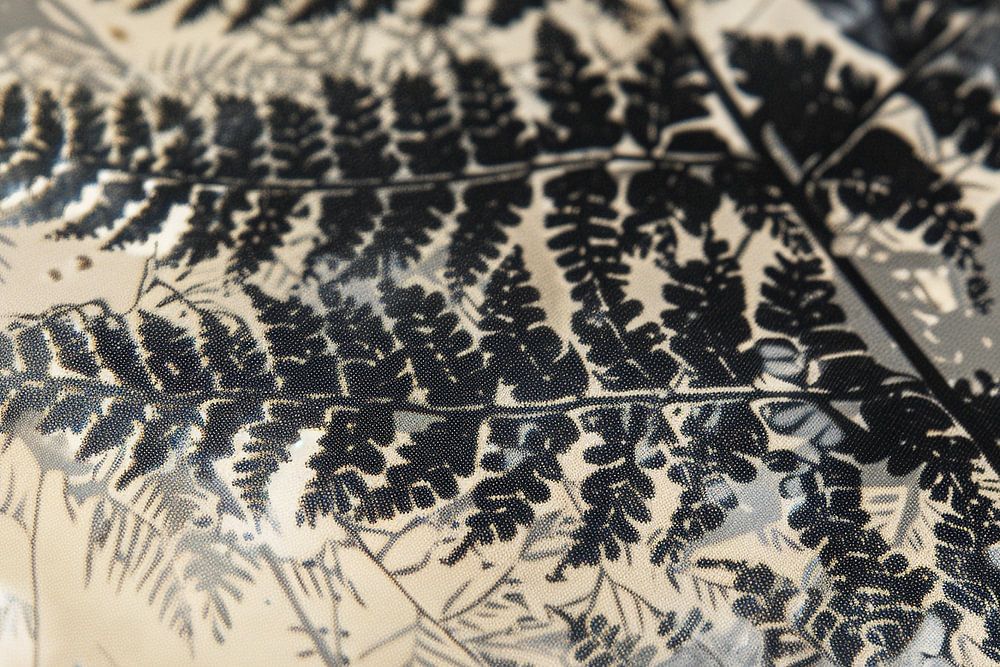 Modern abstract image of ferns and prints of ferns in black, white, beige and grey. Botanical print. Fits various styles and trends including country, black and white, botanical, plants, ferns, sober, minimalist and modern abstract. Artist: Bianca ter Riet.