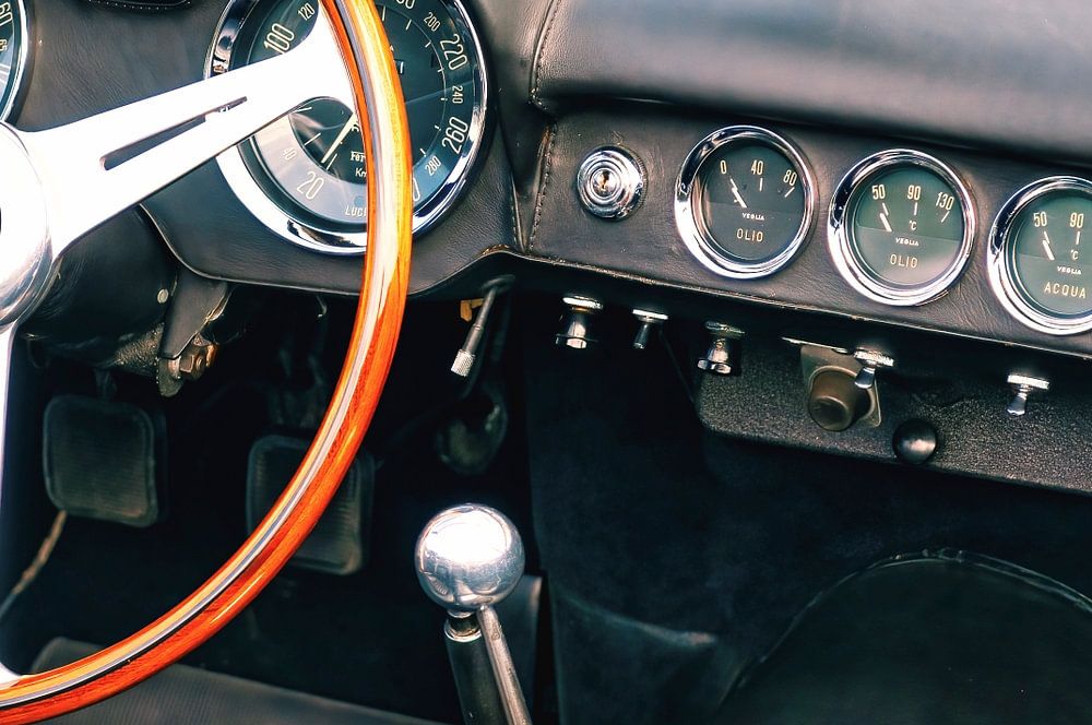 Ferrari 250 GT California Spyder interior with a leather dashboard, wooden steering wheel and chrome details. The 250 GT California was the open version of the Ferrari 250 GT designed by Scaglietti for the American market.