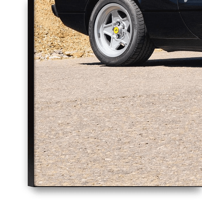 Ferrari 308 GTB sports car in black parked in the paddock. The 308 is a V8 mid-engined, two-seater sports car made by Ferrari from 1975 to 1985 and was available as coupe and targa (GTS).