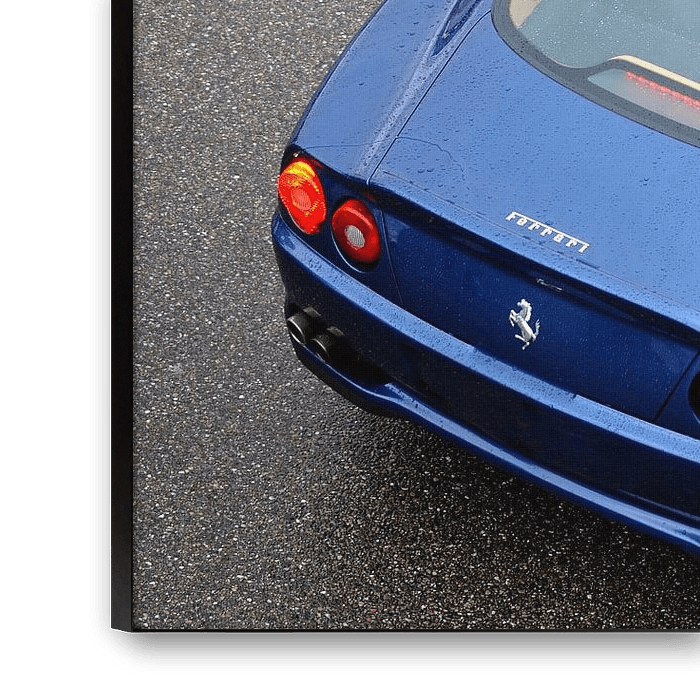 Blue Ferrari 550 Maranello GT sports car in blue seen from above. The Ferrari 550 Maranello (tipo F133) is fitted with a V12 engine and is a 2-seater grand tourer.