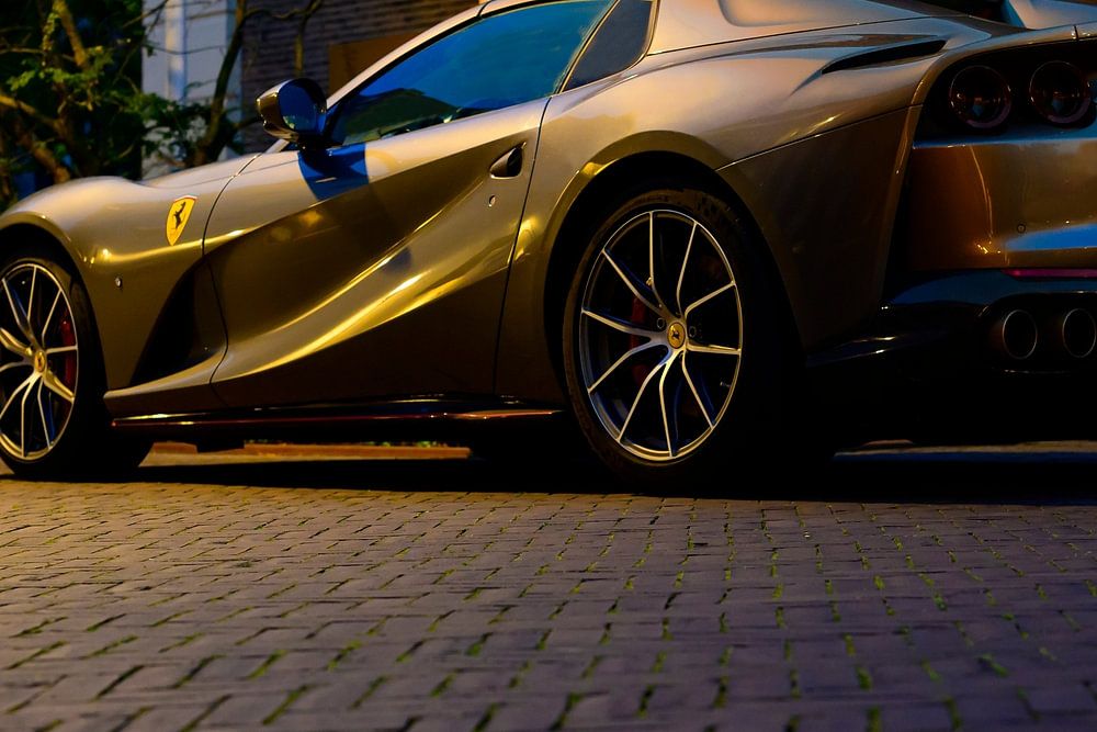 Ferrari 812 GTS V12 spider sports car parked on the street at night. Low angle rear view with the car partly illuminated. The Ferrari 812 GTS is a open-top version of the 812 Superfast, a grand tourer Ferrari powered by a 6.5-liter V12 engine.