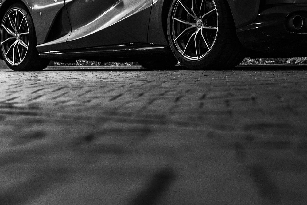 Ferrari 812 GTS V12 spider sports car parked on the street at night. Low angle rear view with the car partly illuminated. The Ferrari 812 GTS is a open-top version of the 812 Superfast, a grand tourer Ferrari powered by a 6.5-liter V12 engine. Black and white photo.