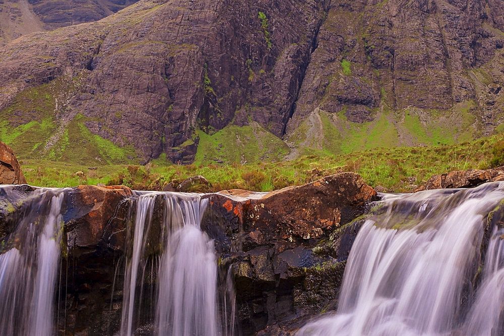 A waterfall in the Ferry Pools in front of a mountain in the Cuillin mountain range.