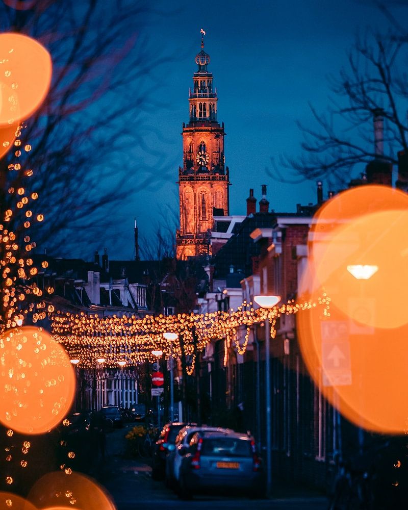 Festival lights in Nieuwe Blekerstraat + an illuminated Martini Tower in Groningen city during the festive months.