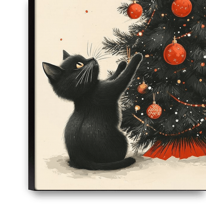 Bring joy and whimsy to the holiday season with this enchanting illustration of playful black cats gathered around and perched on a beautifully decorated Christmas tree. With glowing orange and gold ornaments, twinkling stars, and curious feline expressions, this artwork captures the magic of Christmas and the mischievous charm of our…