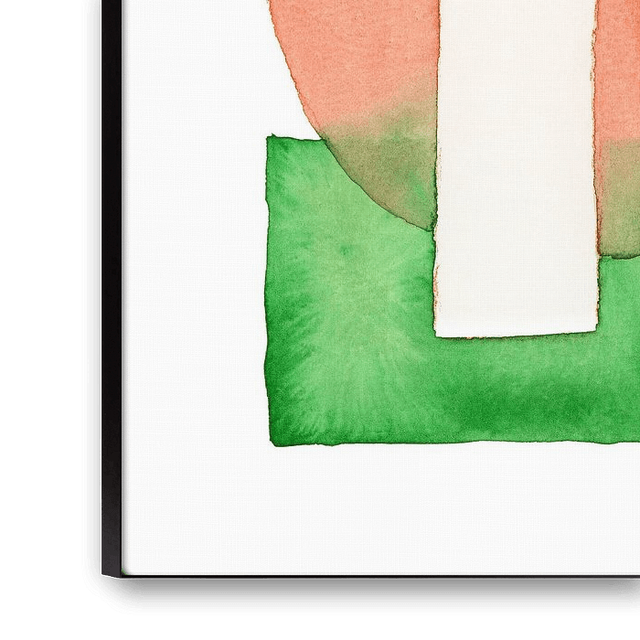 The watercolour painting shows a minimalist composition of overlapping geometric shapes in shades of red, green and yellow. A white candle is placed prominently in the centre, creating a balanced and harmonious composition.
