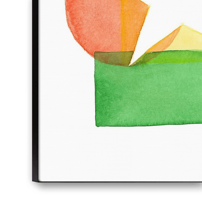 The watercolour painting shows a minimalist composition of overlapping geometric shapes in shades of red, green and yellow. A white star shape is placed prominently in the centre, creating a balanced, harmonious composition.