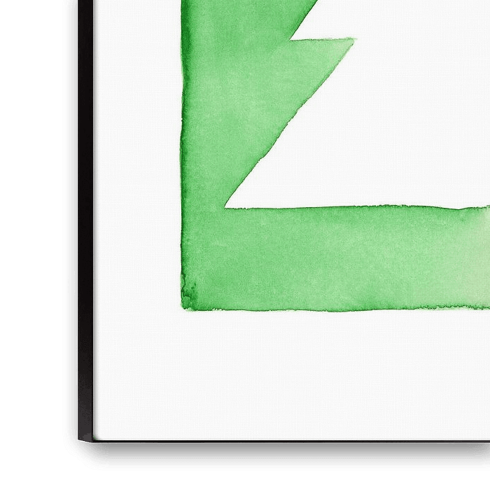 The watercolour painting shows a minimalist composition of overlapping geometric shapes in shades of red, green and yellow. A white Christmas tree is placed prominently in the centre, creating a balanced and harmonious composition.
