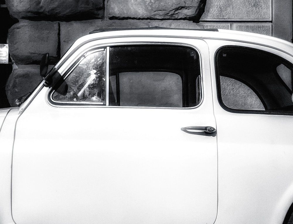 Zwart Wit foto van een authentieke Fiat 500 in het Italiaanse straatbeeld