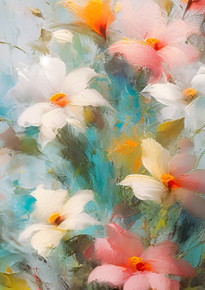 Spring flowers in the Impressionist style of Claude Monet, set up with a loose touch and visible brushstrokes. The light in which the flowers are shown gives the impression that the work was painted outdoors with morning light. This cheerful-looking work will enrich your wall and attract the attention of everyone who sees it.