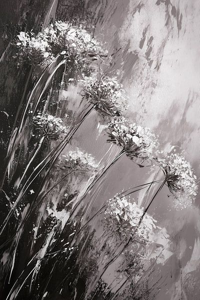In this black-and-white image, a tranquil moment in nature unfolds. Slender stems of umbelliferous flowers rise from a field of soft, subtle shades of grey. Their delicate flower heads spread out like tiny stars or delicate lace patterns, light and almost weightless against the background.