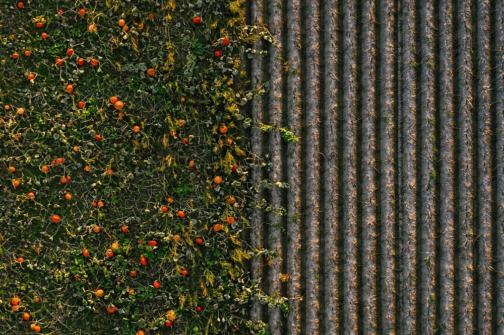 Field full of orange pumpkins at the end of the summer. Field was photographed from the air with a drone. Different perspective always makes it interesting to look at.