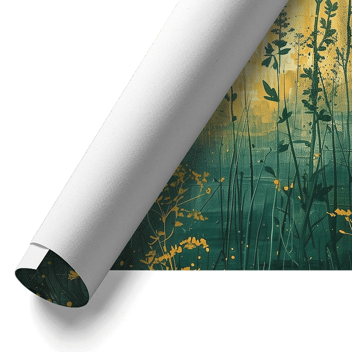 A tranquil field in which slender, upright plants form silhouettes against a warm, golden yellow sky. The composition transitions from deep green in the lower half to a radiant yellow in the upper zone, creating an intense colour gradient reminiscent of sunlight during the golden hour. The vertical stems draw the eye upwards and lend…
