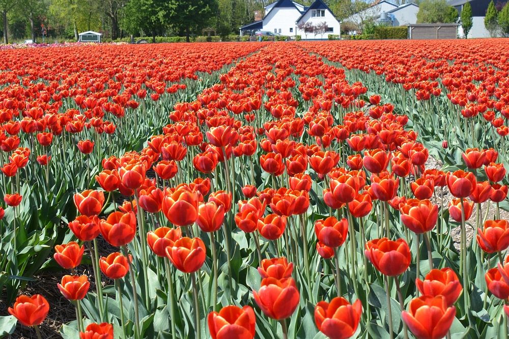 Every year, we go out walking or cycling near the bulb fields. On a cycling trip through the Noordoostpolder in Flevoland, we passed by a huge number of beautiful flowering tulips. This field of red tulips is truly a feast for the eyes. The tulips bloom roughly from April to mid-May, depending on the weather of the particular year.