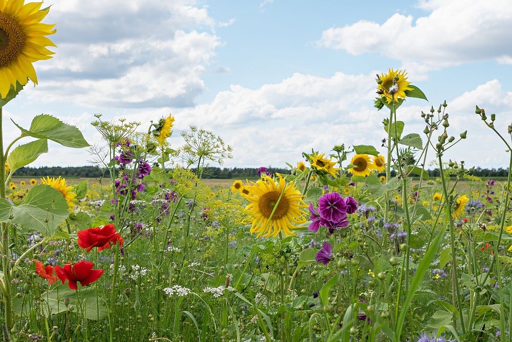 Field with sunflowers mallow blossoms, phacelia and poppies