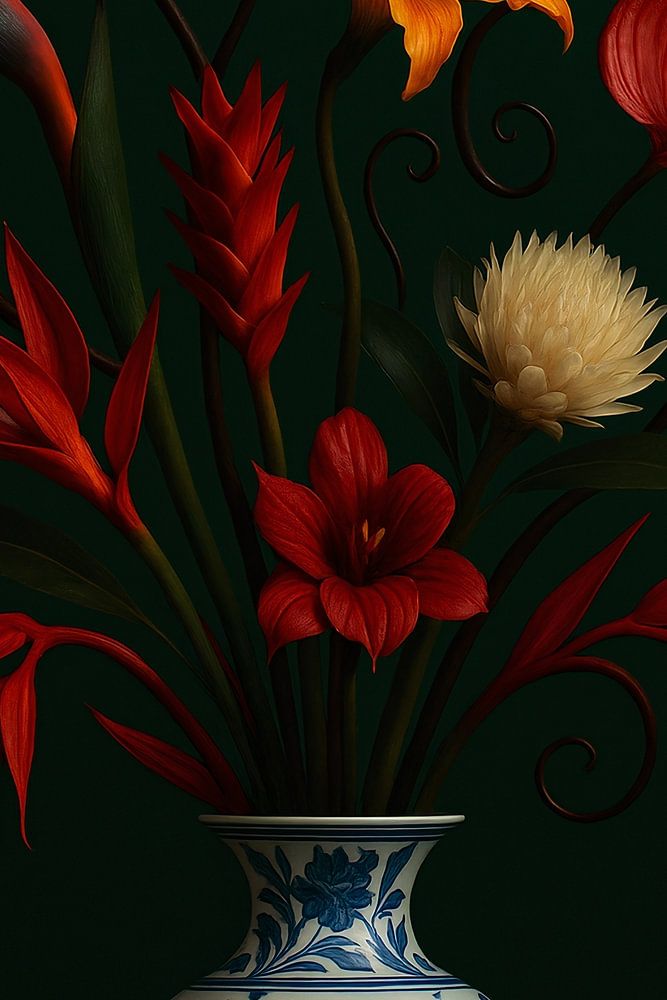 A sophisticated still life with tropical flowers in warm shades of red and orange, placed in a hand-painted Delft blue vase. Stylish, intense and graceful.