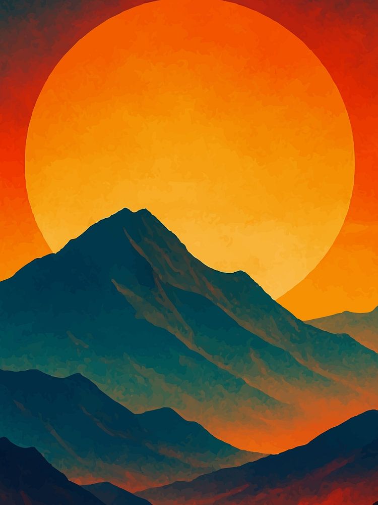 Fiery Sunset Peaks is a mountain sunset themed artwork with strong visual appeal and modern tone. Ideal for digital collectors and decor enthusiasts looking for unique wall art pieces.
