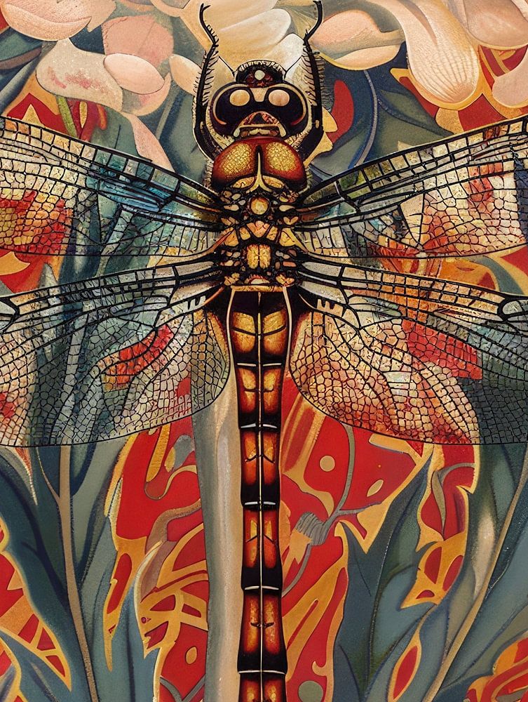 This artistic, lovely artwork is a vibrant composition that combines the natural splendour of a dragonfly with a colourful explosion of flowers.