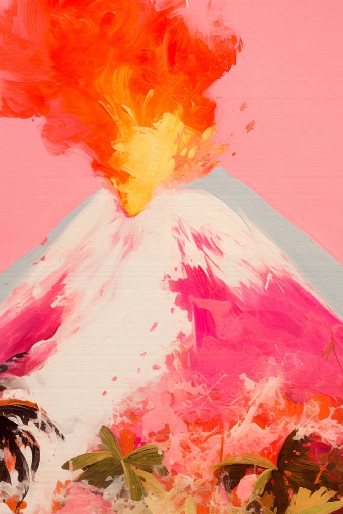 "Fiery Zenith" is a powerful artwork that captures the majestic beauty of an erupting volcano. The bright colours of the lava spewing from the crater contrast sharply with the calmness of the tropical flora and the serene palm tree lines at its base. This work brings together the contradictory nature of destruction and beauty and would add a dramatic and dynamic element to any space it adorns.