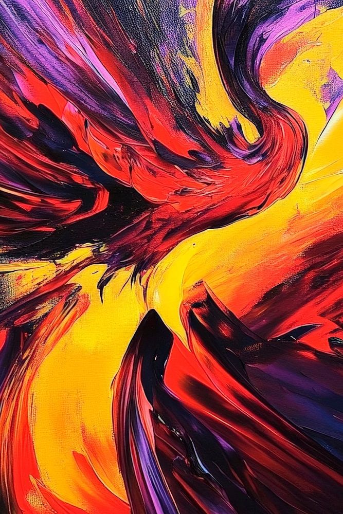 Amidst vibrant red tones and radiant yellow, an artistic explosion unfolds, reminiscent of the rise of a majestic phoenix. The dynamic strokes add energy and passion to the room. Perfect for the living room to inspire guests and spark lively conversations.