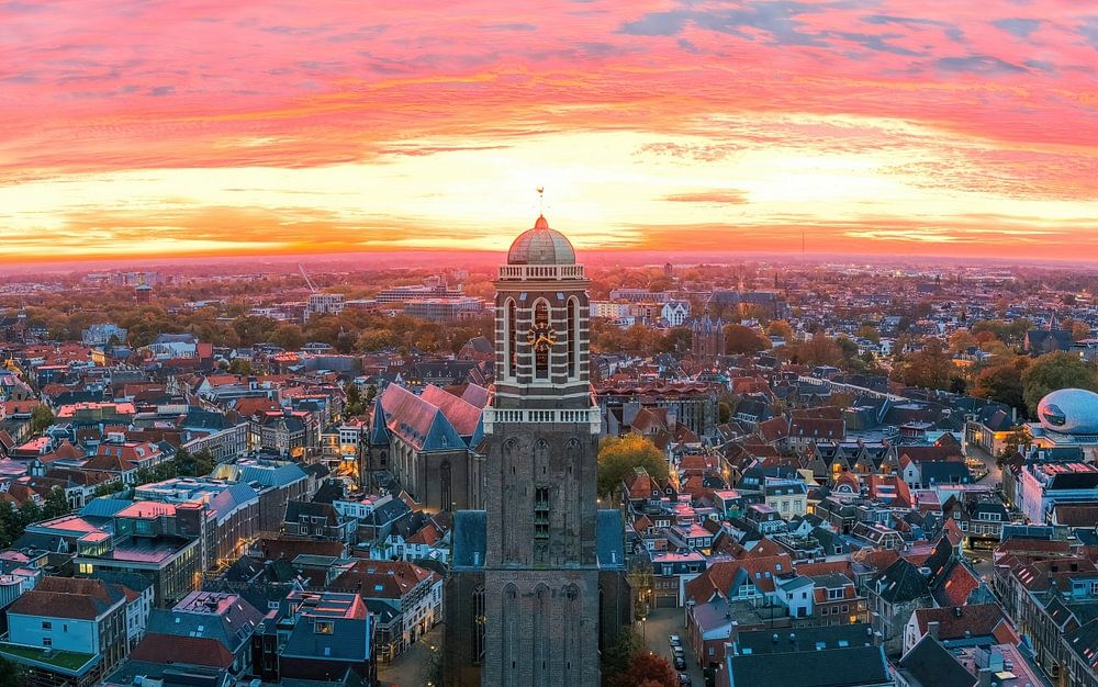 A fiery sunrise over the heart of Zwolle, with the Peperbus standing proudly at its centre. The first rays of sunlight break through the cloud cover and colour the sky in an explosion of pink, orange and blue. It is that rare moment when the city is still silent but the day is already announcing itself. From this high vantage point, the characteristic street pattern of Zwolle city centre unfolds: winding alleys, ancient facades and the rhythm of centuries-old architecture converging around the iconic tower.