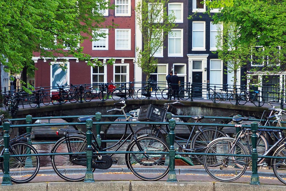 Prachtige opname van de Herengracht kijkend naar de bruggen over de Leidsegracht in Amsterdam met fietsen op de bruggen in de lente