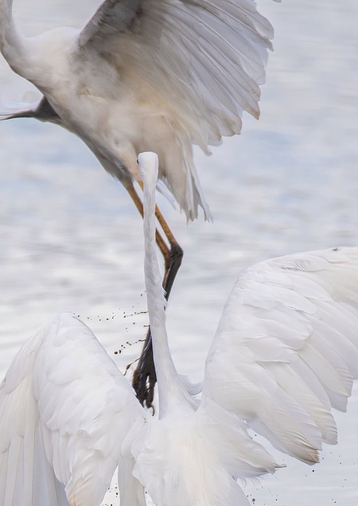 About "Fighting White Herons in portrait mode in a beautiful collection of grey tones."
