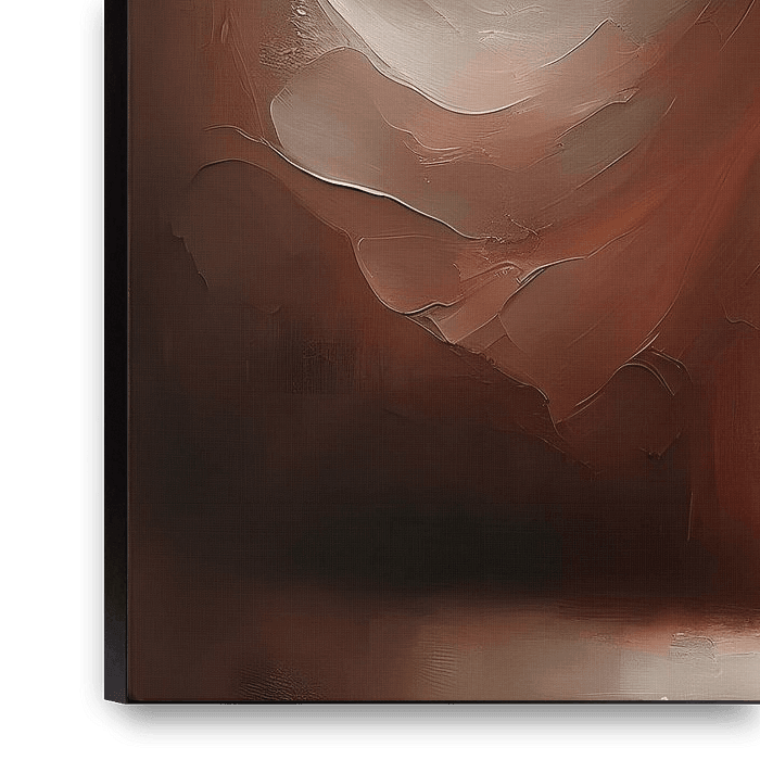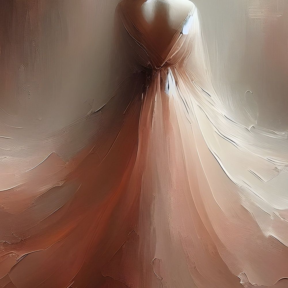 Abstract oil work, expressive brushstrokes and thick paint texture (impasto), earth tones such as ochre, sienna and warm brown. A female figure at the centre of the picture, partly abstractly rendered, dressed in a long pale pink dress that subtly contrasts with the earthy background. Minimalist shapes, emotional atmosphere, gentle…
