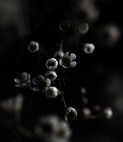 Chamelaucium uncinatum - The official name for these wax flowers. You can hardly take ugly photos of these little flowers, they look sweet and delicate, and that's exactly why I liked to photograph them a little darker, with lots of contrast, looming in the dark.